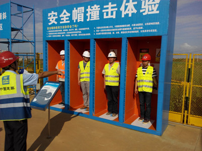 安全体验馆内设有安全案例教育体验区、PPE劳动保护体验区、作业环境体验区、消防安全体验区、用电及设备体验区等。在体验区内员工可以模拟体验触电、洞口坠落、安全帽撞击、梯子攀爬等12种“安全伤害”。中建商砼20多名各岗位员工共同参与体验。