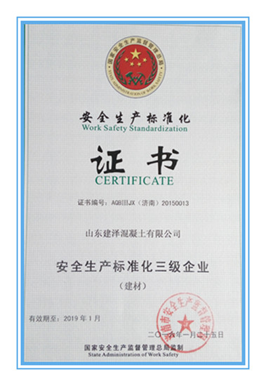 (通讯员 范月洋)4月8日,中建西部建设新疆公司所属山东建泽公司获得由济南市安全生产监督管理局颁发的“安全生产标准化三级企业”证书。山东建泽公司始终严格落实安全生产各项制度,以司属章丘站为标杆站点,不定期开展各类专项检查和隐患排查活动,对检查出的安全隐患及时通报、整改,并完善安全标准化各项制度体系。同时加强对场站安全生产隐患的排查力度,做到及时发现及时清除,将安全管理贯彻到生产运营的方方面面。