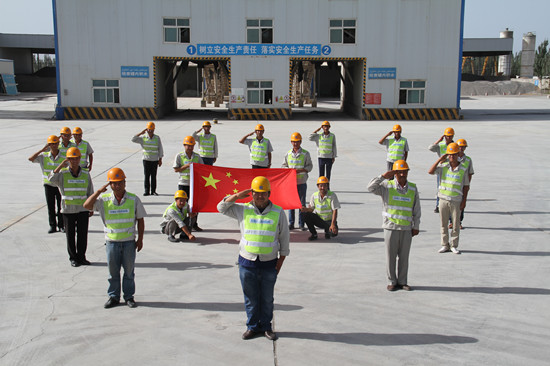 8月1日上午10时,新疆公司举行升国旗仪式。一支拥有16年传承历史的国旗班队伍,迈着铿锵有力的步伐,在响彻蓝天的国歌声中,护卫红旗冉冉升起。全体员工又一次接受了“红色”爱国主义教育洗礼,弘扬了伟大抗战精神。同时,新疆公司喀什厂员工在厂区内组成心形队形,向“最可爱的人”献上军礼,以此表达对军人们的崇高敬意。