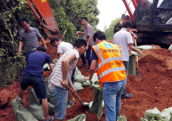 7月21日晚,受第六轮强降雨影响,湖北孝感府河东山头决堤,导致紧邻武汉天河机场跑道及办公新区的童家湖水位一夜间上涨3米。当晚7点50分许,武汉市防汛抗旱指挥部迅速锁定机场安全地面标高,对低于安全标高的四个区域,投入数百人的抢险力量来连夜奋战抢筑加固机场安全防线。中建西部建设所属中建商砼机场厂按照指挥部统一部署,组织铲车2台、党员6人参加抢险突击队,连夜奋战整整12个小时,共修筑挡水堤坝4公里,加固了武汉天河机场安全防线,避免湖水水倒灌。