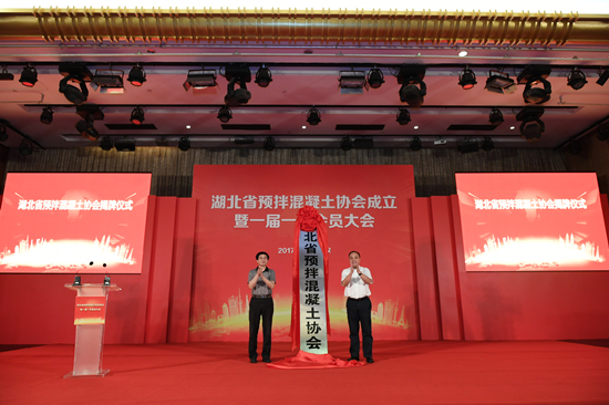 湖北省散装水泥办公室主任石中林与新当选的协会会长、中建商品混凝土有限公司董事长、党委书记胡立志共同为协会揭牌。